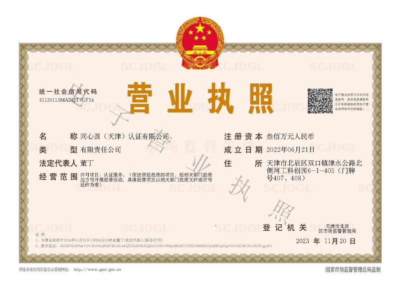同心圓(天津)認(rèn)證有限公司[英文:Concentric Circles (Tianjin) Certification Co., Ltd]是經(jīng)中國國家認(rèn)證認(rèn)可監(jiān)督管理委員會批準(zhǔn)(批準(zhǔn)號:CNCA-R-2023-1266),在中國注冊的具有獨(dú)立法人資格的第三方認(rèn)證機(jī)構(gòu)。成立于2022年06月21日,注冊地位于天津市北辰區(qū)津永公路北側(cè)河工科創(chuàng)園6-1-405(門牌號407、408),法定代表人為董丁。