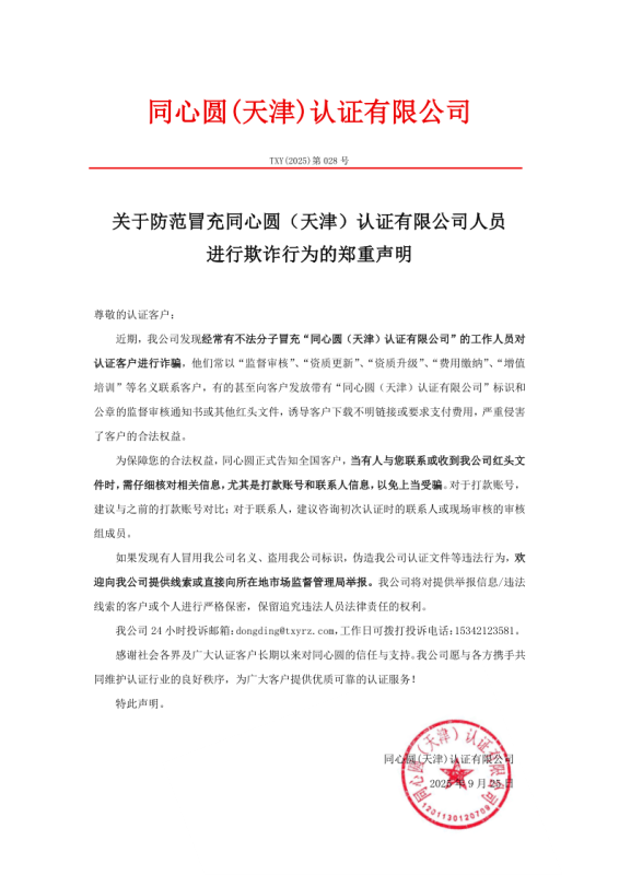 關(guān)于防范冒充同心圓(天津)認證有限公司人員進行欺詐行為的鄭重聲明
