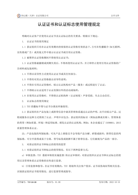TXY-GK-08_01.00 認證證書和認證標(biāo)志使用管理規(guī)定